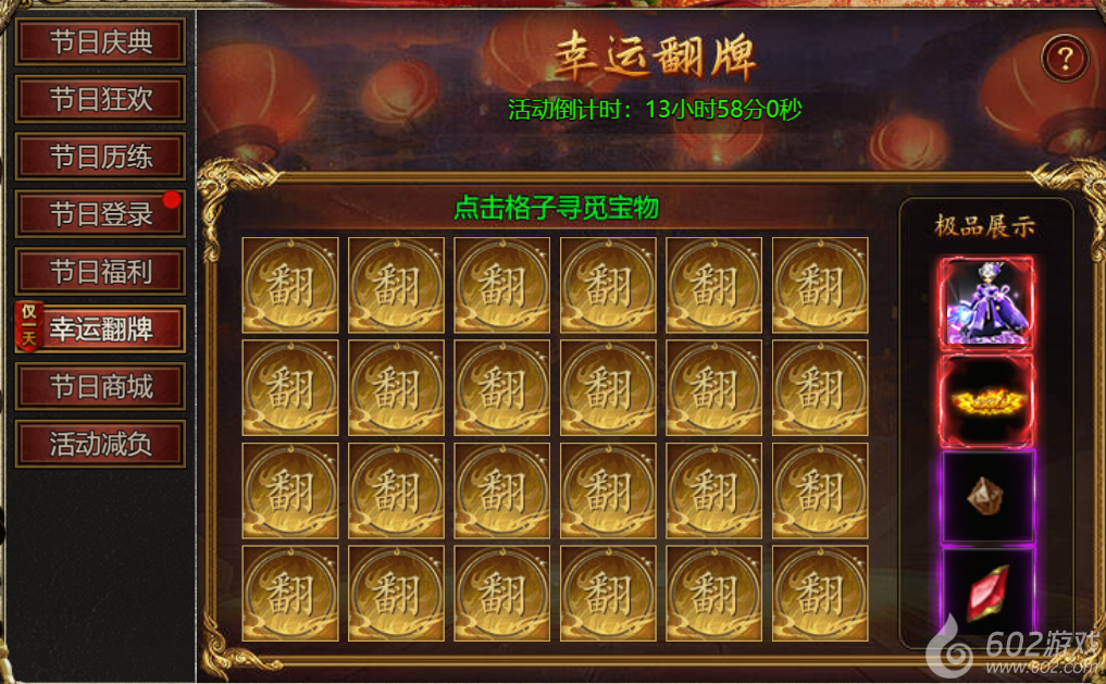 【活动内容】:活动期间,可消耗幸运之力进行翻牌,全部翻完奖励全部获得!